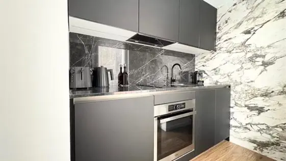 The apartment comprises a living room, a kitchen (fridge, dishwasher, induction hob, oven, and microwave), a shower room (washbasin and shower), and a toilet in the hallway.