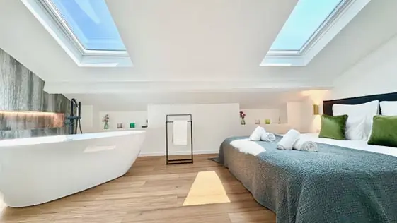Upstairs are two very bright bedrooms, one of which has a sink and bathtub.